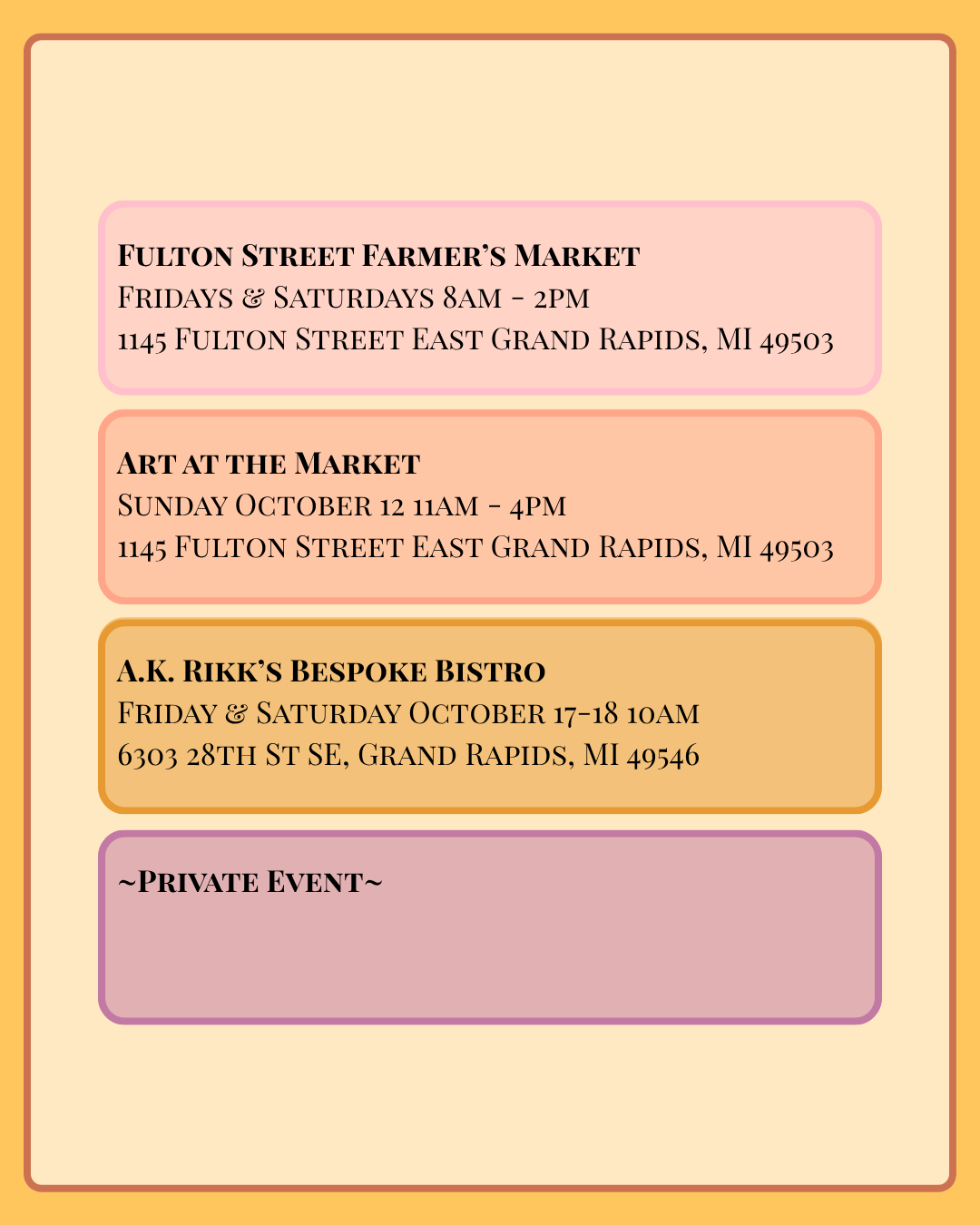October Events Come visit us at one of our popup events this month!To book a private catering event, click here. Permanent Popups: